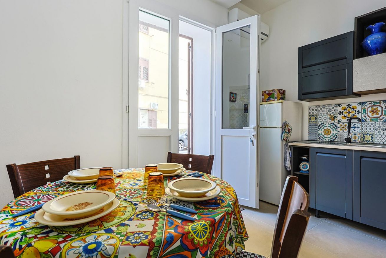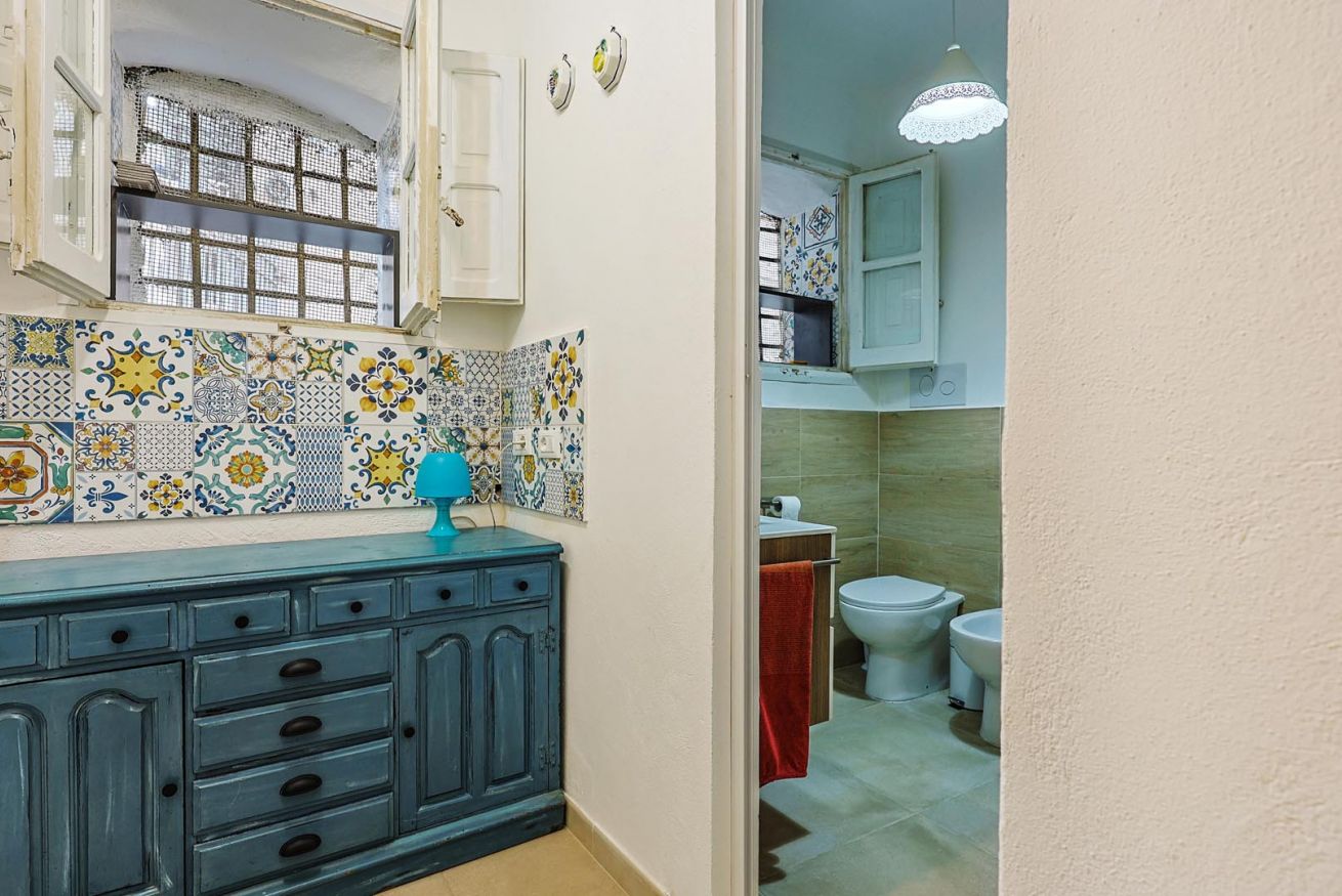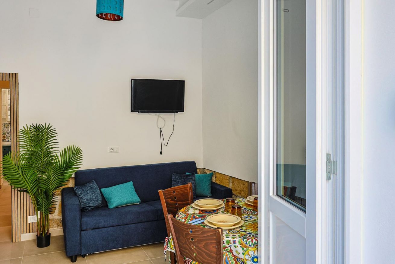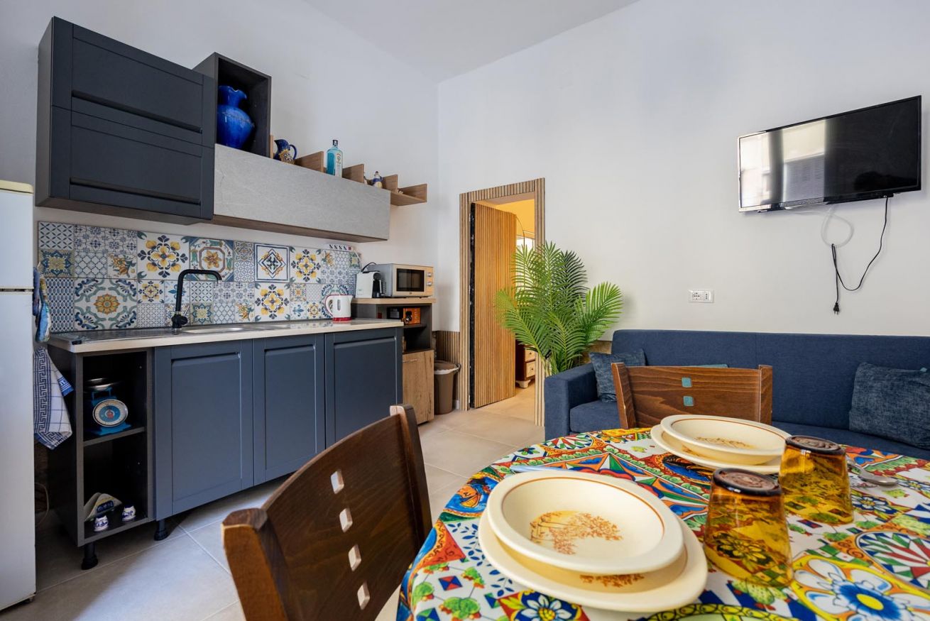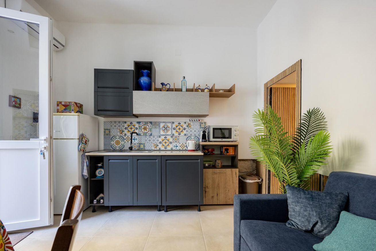 Varcando la soglia, la casa si apre su un ampio e luminoso soggiorno, pensato come uno spazio accogliente e versatile, con un comodo divano letto matrimoniale e una raffinata zona pranzo, perfetta per momenti di relax o cene romantiche. Nello stesso ambiente trova spazio una cucina intima e deliziosa, impreziosita da maioliche dai colori vivaci, che richiamano l’arte e la tradizione palermitana, creando un’atmosfera gioiosa e autentica.