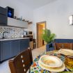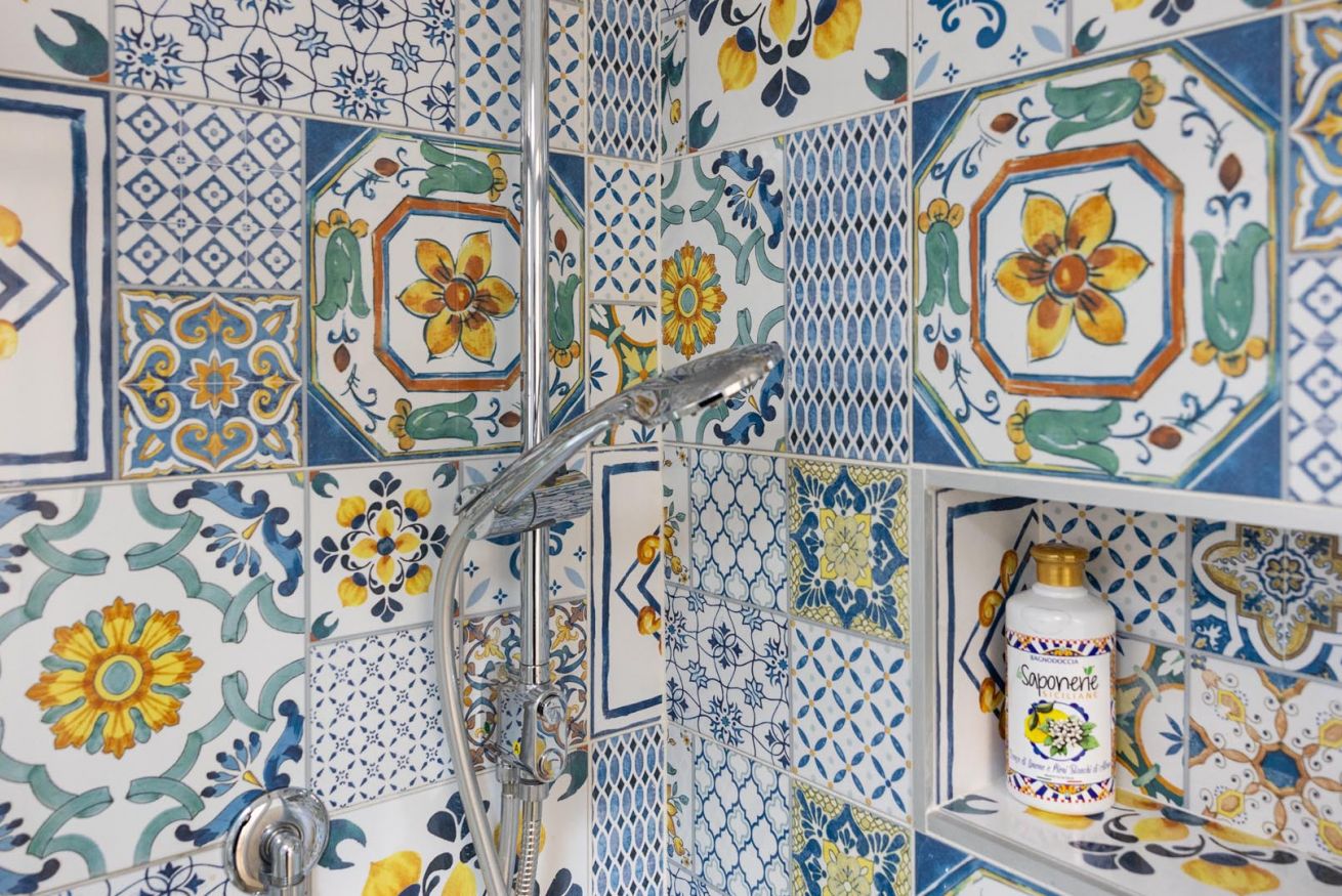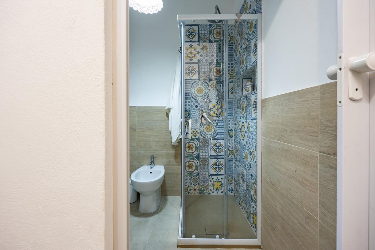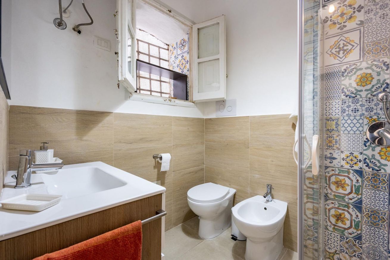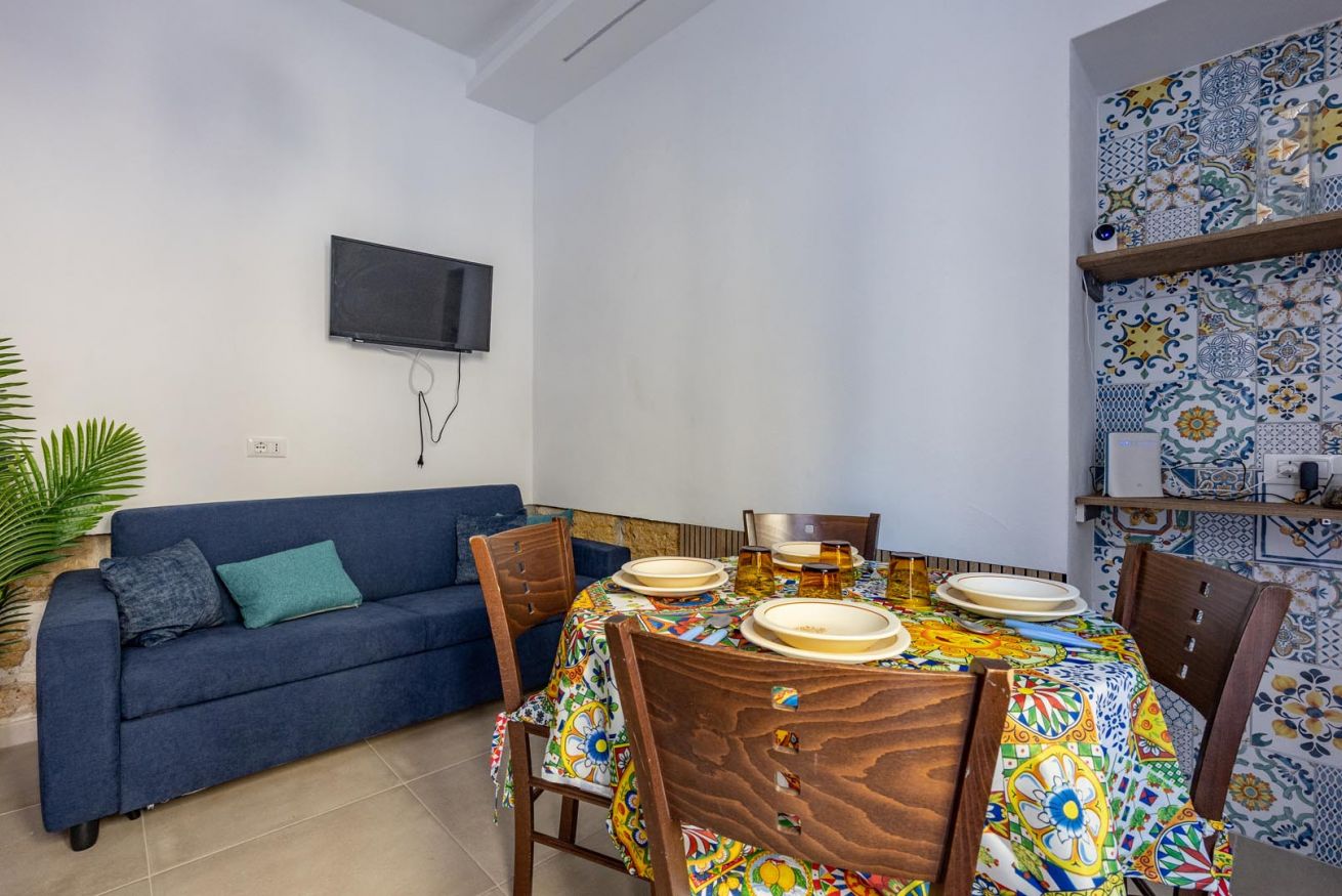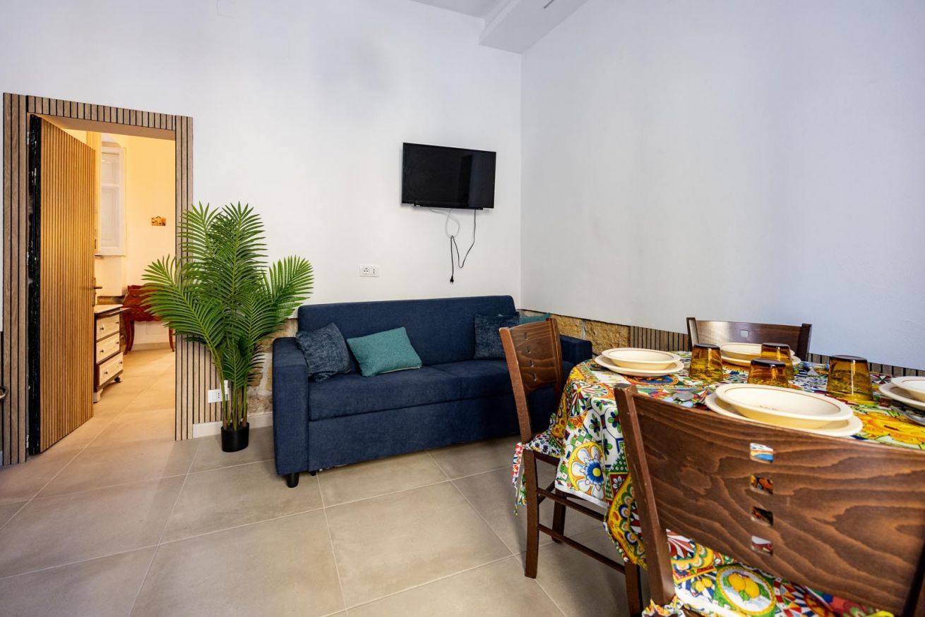 Varcando la soglia, la casa si apre su un ampio e luminoso soggiorno, pensato come uno spazio accogliente e versatile, con un comodo divano letto matrimoniale e una raffinata zona pranzo, perfetta per momenti di relax o cene romantiche. Nello stesso ambiente trova spazio una cucina intima e deliziosa, impreziosita da maioliche dai colori vivaci, che richiamano l’arte e la tradizione palermitana, creando un’atmosfera gioiosa e autentica.