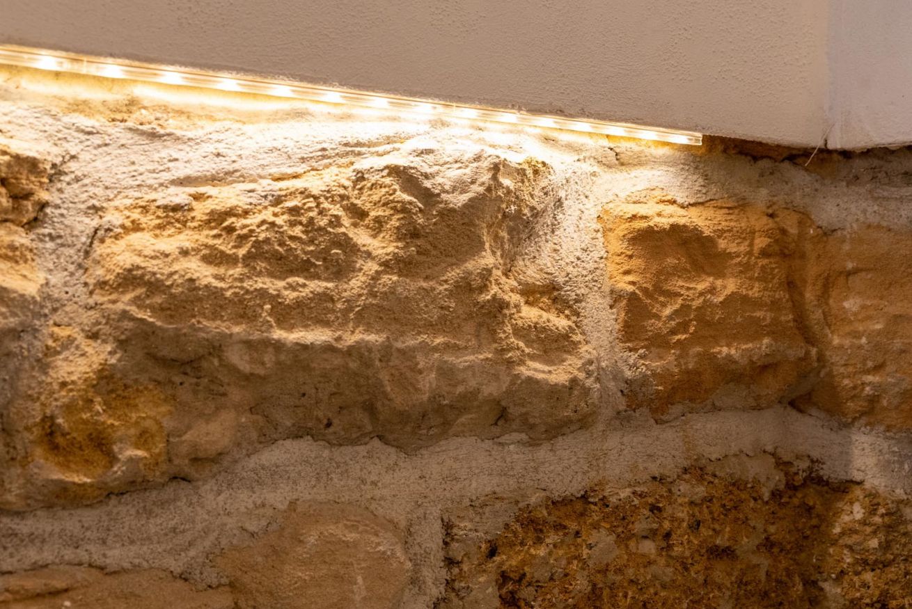 La zona notte ospita una camera matrimoniale elegante e suggestiva, arricchita da una splendida testata in pietra locale a vista, un dettaglio di grande fascino che racconta la storia e l’identità del territorio, avvolgendo l’ambiente in un’atmosfera calda e romantica. Completa gli interni un bagno completo, moderno e curato, rifinito con materiali di qualità e pensato per offrire il massimo comfort.