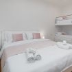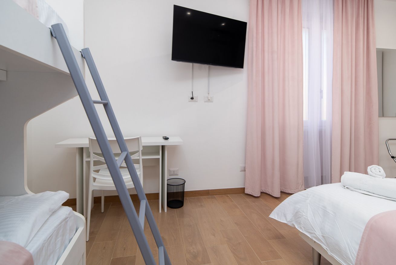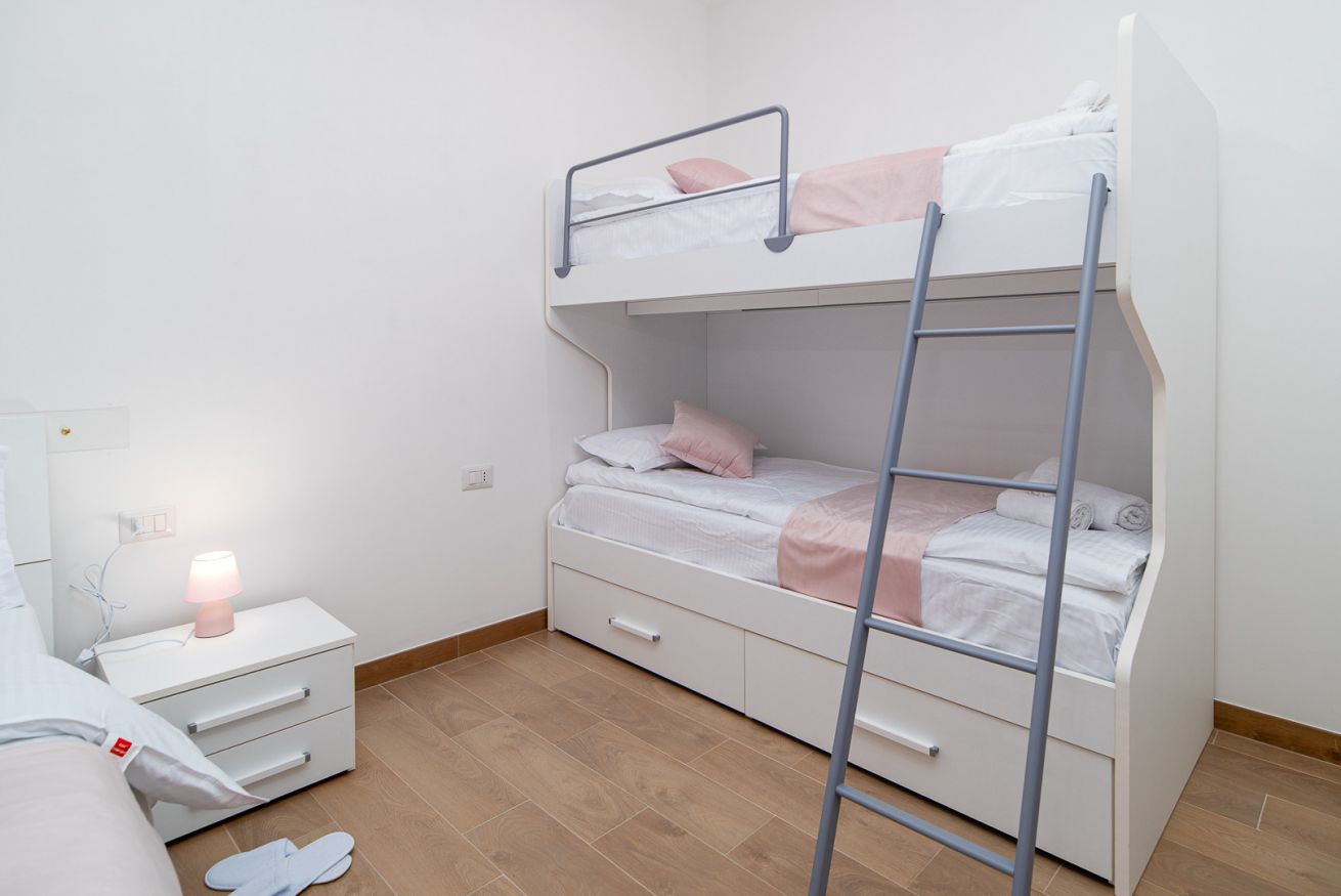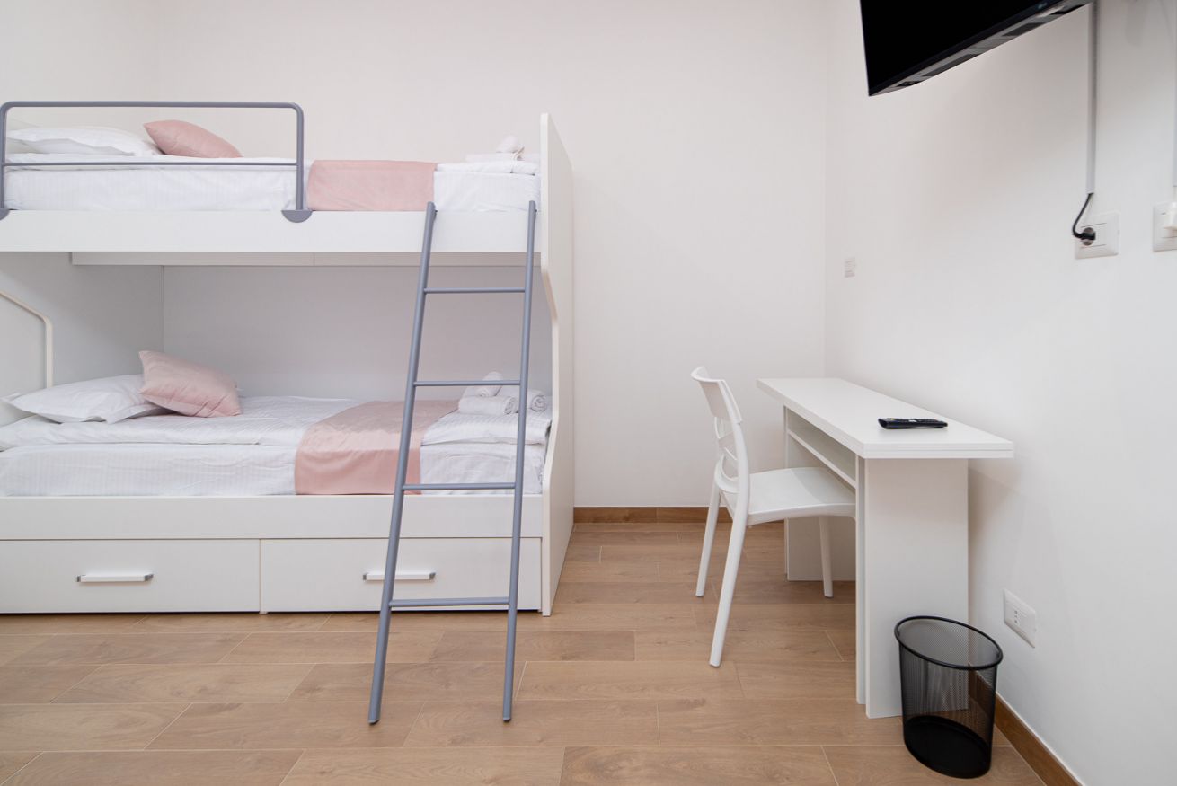 Questa stanza, ideale per famiglie o gruppi, è composta da un comodo letto matrimoniale e un pratico letto a castello, perfetta per ospitare fino a 4 persone. L'arredamento moderno e raffinato è stato pensato per garantire il massimo comfort, con una particolare attenzione al design. La Room 1 è dotata di aria condizionata, TV a schermo piatto e connessione Wi-Fi gratuita, per garantire il massimo del relax e dell'intrattenimento durante il soggiorno.