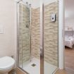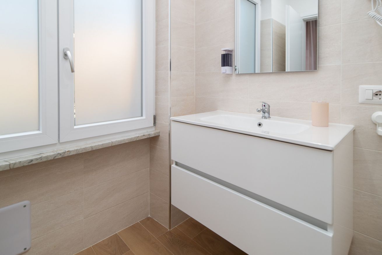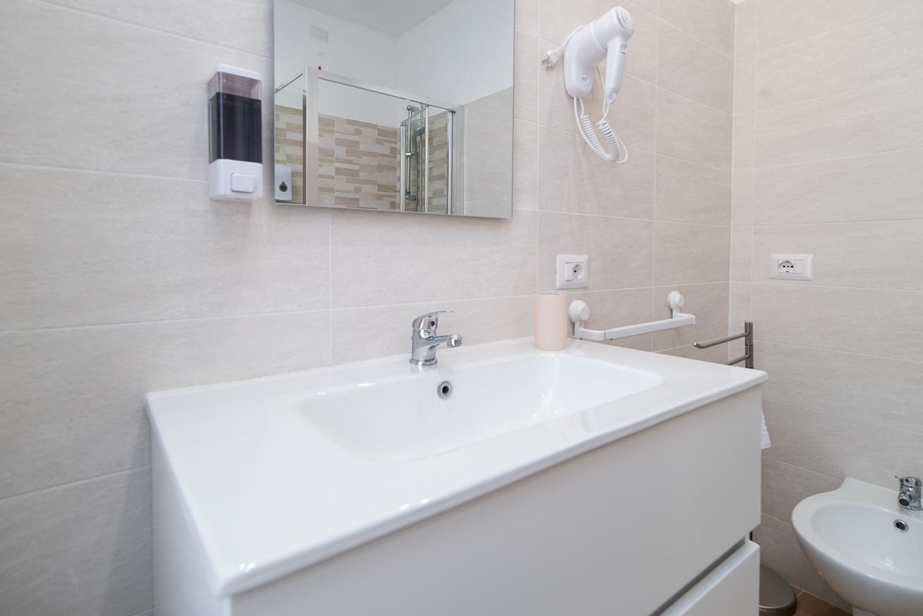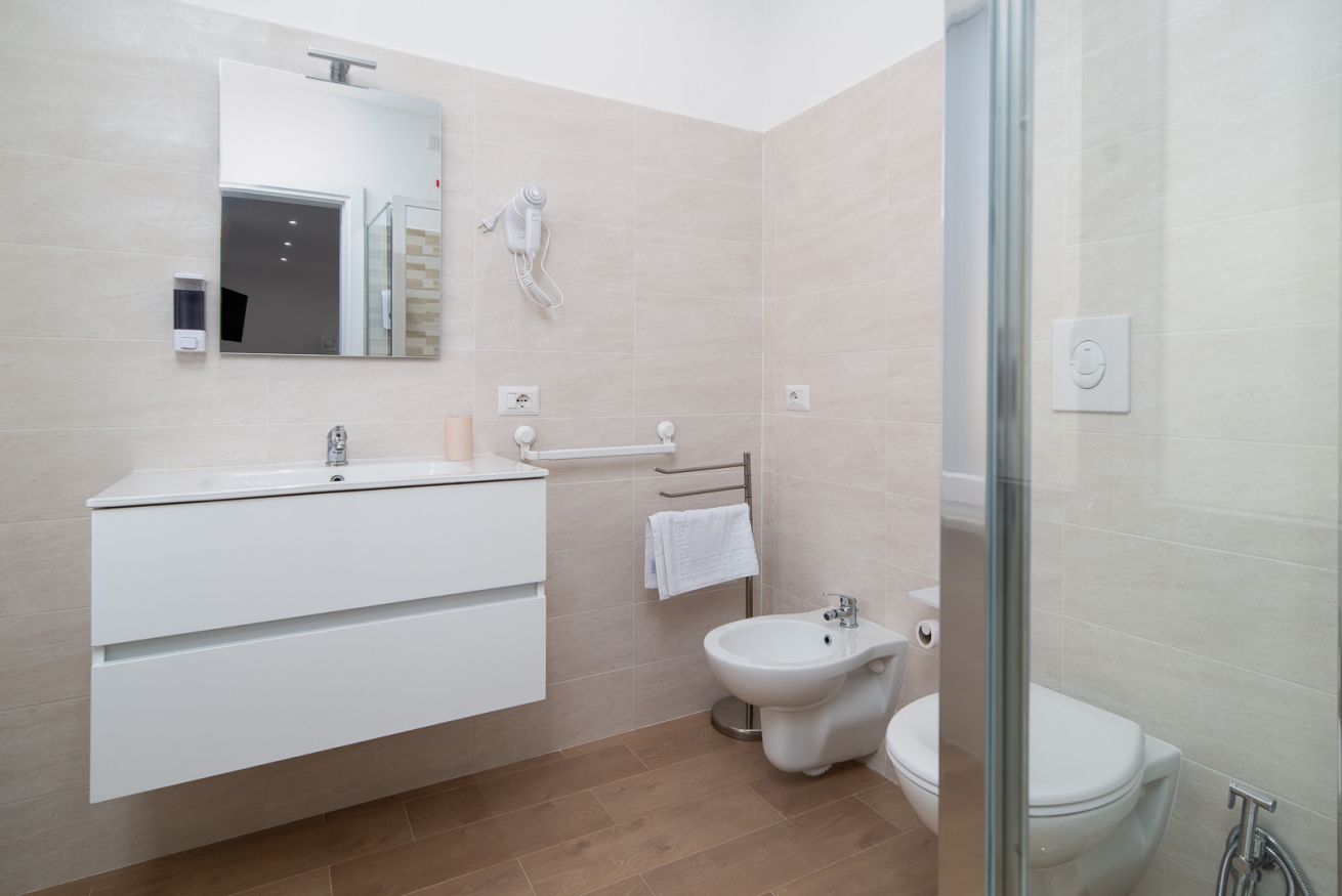 Il bagno privato, elegante e ben rifinito, è completo di tutti i comfort, tra cui una doccia spaziosa, set di cortesia e asciugamani freschi, per offrire una piacevole esperienza di benessere.
