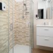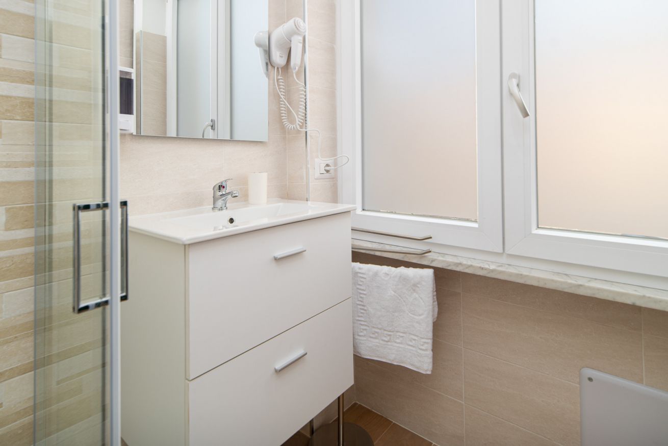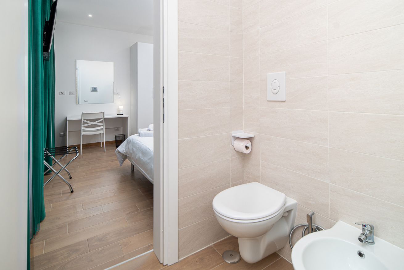 Il bagno privato, elegantemente rifinito con materiali moderni, è completo di tutti i comfort, tra cui una spaziosa doccia, set di cortesia e asciugamani freschi, offrendo una piacevole esperienza di benessere.